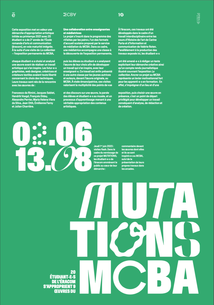 Poursuivant une tradition grandissante de collaboration de la filière maturité avec le MCBA musée cantonal des beaux-arts (ce projet en est à sa 3e mouture), les élèves maturant.e.s de la classe MP321 ont vernis l’exposition MUTATIONS.